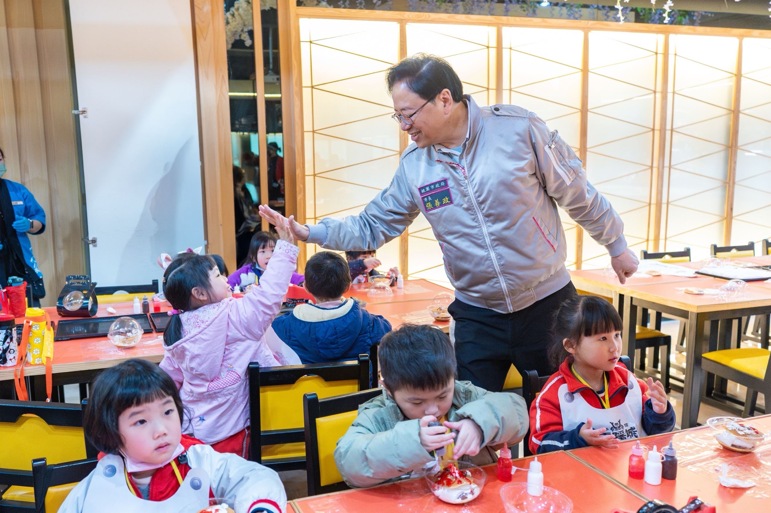 ▲張善政與孩子擊掌。(圖/桃園市新聞處 提供)
