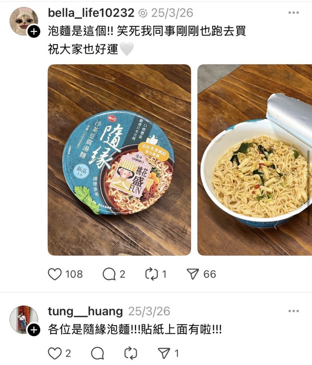 結果PO文一出,不少網友紛紛留言求「泡麵名」、「哪款泡麵」、「脫單神貼」,還有網友當起了愛情教練,教女網友怎麼回應帥哥的邀約,最後原PO也大方上傳泡麵照片,原來是知名的隨緣素泡麵系列「沙茶豆腐湯麵」,並有附贈的「媽祖祈福貼紙」,除了Q版的媽祖圖像之外,上面還有「桃花盛開」的字眼,網友直呼「太神了!」、「有貼有保庇」、「要搶買起來」,還有網友PO文說到「缺貨了」、「上週還有看到,這週就被買光了」。