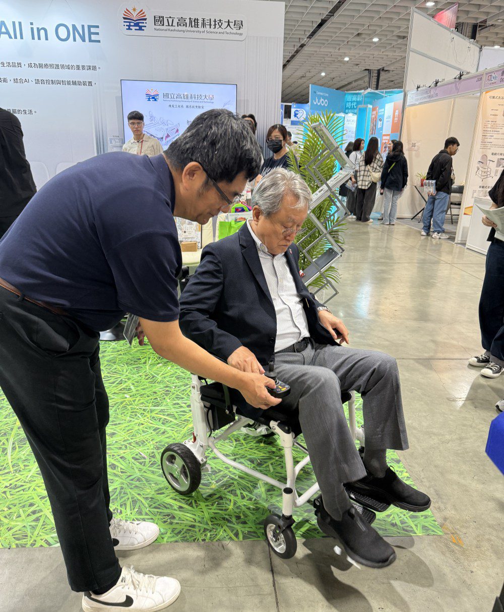 更由2024年輔具展市場回饋發想,兩位老師協力跨域研發智慧語音控制輪椅,由外觀簡約輕巧且具一鍵收折特色的自動輪椅,融合語音指令與智能導航系統,使用者可藉語音操控方向與行進,內建 AI 跌倒偵測與即時警報系統,強化居家與外出安全,成為未來行動輔具新趨勢。
