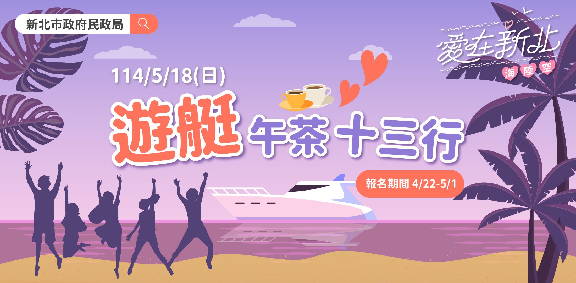 為打造適齡婚育友善城市,新北市114年單身聯誼活動即將展開,今年主題為《愛在新北 海陸空》,帶領單身男女暢遊新北特色景點。首場「遊艇午茶‧十三行」活動即將於4月22日上午9時開放報名至5月1日下午5時止,邀請60位單身男女共赴一場融合文化與浪漫的尋愛旅程,在淡水河畔遇見心動的緣分。