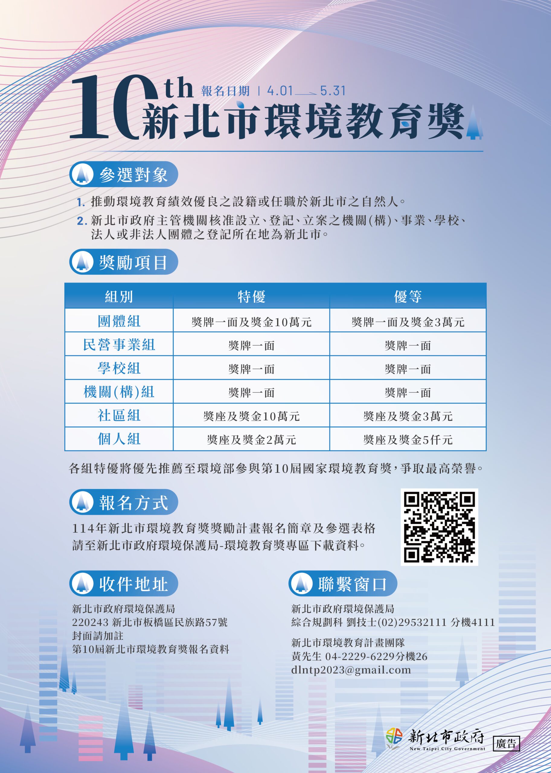 環保局表示,凡具推廣環境教育績效,且具影響力與創新作為者,皆可直接提出申請或由單位推薦參選。後續經由專業評選脫穎而出的優勝者,不僅可獲得表揚獎座與獎金,還有機會代表新北市角逐國家級環境教育獎成為典範,發揮更大的影響力,帶領更多人投入永續行動。