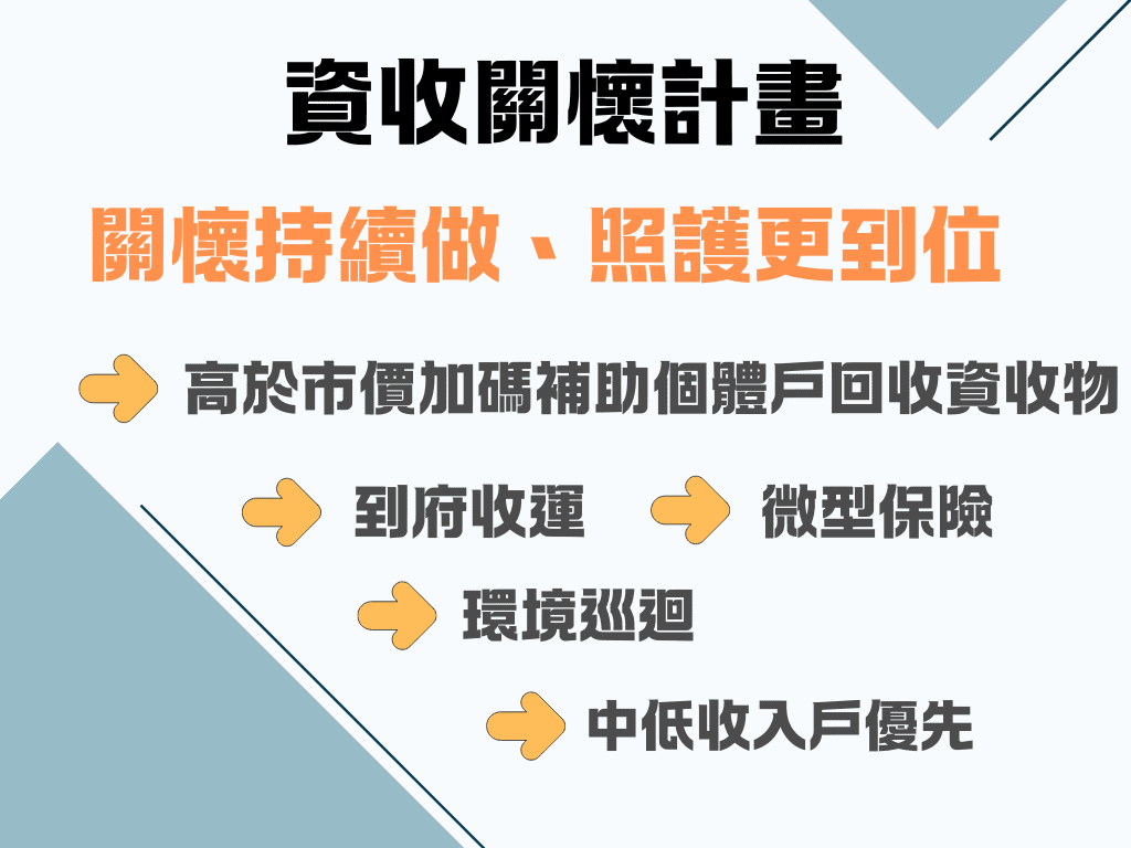為照顧辛勞的弱勢資收個體戶,花蓮縣環保局今年度持續攜手各鄉鎮市公所清潔隊辦理「資收關懷計畫」,提供普遍優於回收市場的價格及到府收運服務,補助個體戶每個月最高5,000元,希望照顧更多有需求的資收個體戶,增加收益,使生活更有保障。