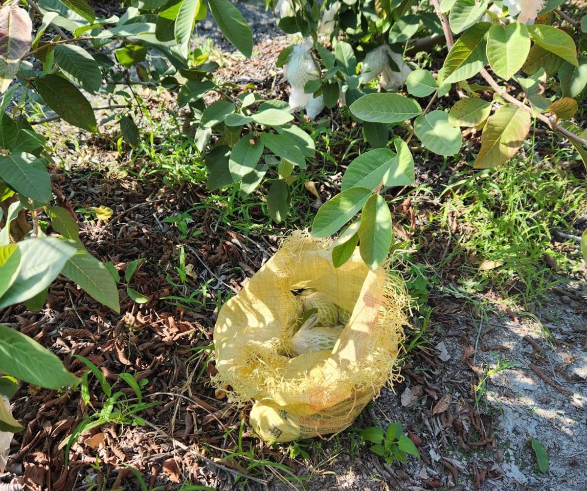 ▲男子正在專注地摘取芭樂,地上已經裝滿一袋,約重20公斤。(圖/田中分局提供)
