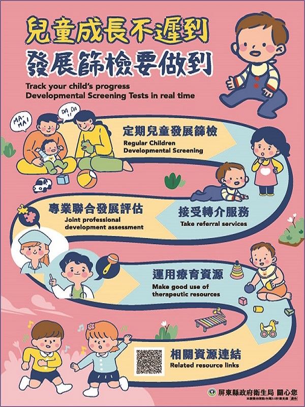 衛生局說明,孩子的成長只有一次,呼籲家長千萬不要覺得害怕孩子被標籤化或忽視其嚴重性,若經篩檢發現疑似發展遲緩,醫師會透過健保署「電子轉診平台」轉介至本縣4家兒童發展聯合評估中心進行後續診斷與評估治療,篩檢治療一條龍,服務不漏接。