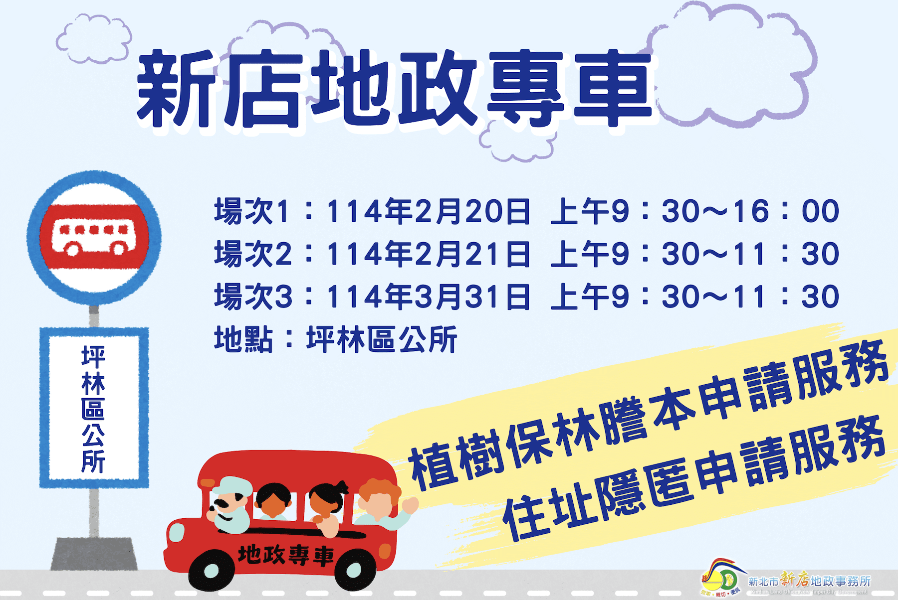 新北市新店地政事務所「植樹保林謄本申請服務地政專車」即將巡迴至坪林服務囉!本次主題式專車共出隊3場,分別為114年2月20日上午9時30分至下午4時及2月21日、3月31日上午9時30分至11時30分,於坪林區公所前廣場為鄉親們服務,歡迎到現場體驗地政專車的便利與貼心!
