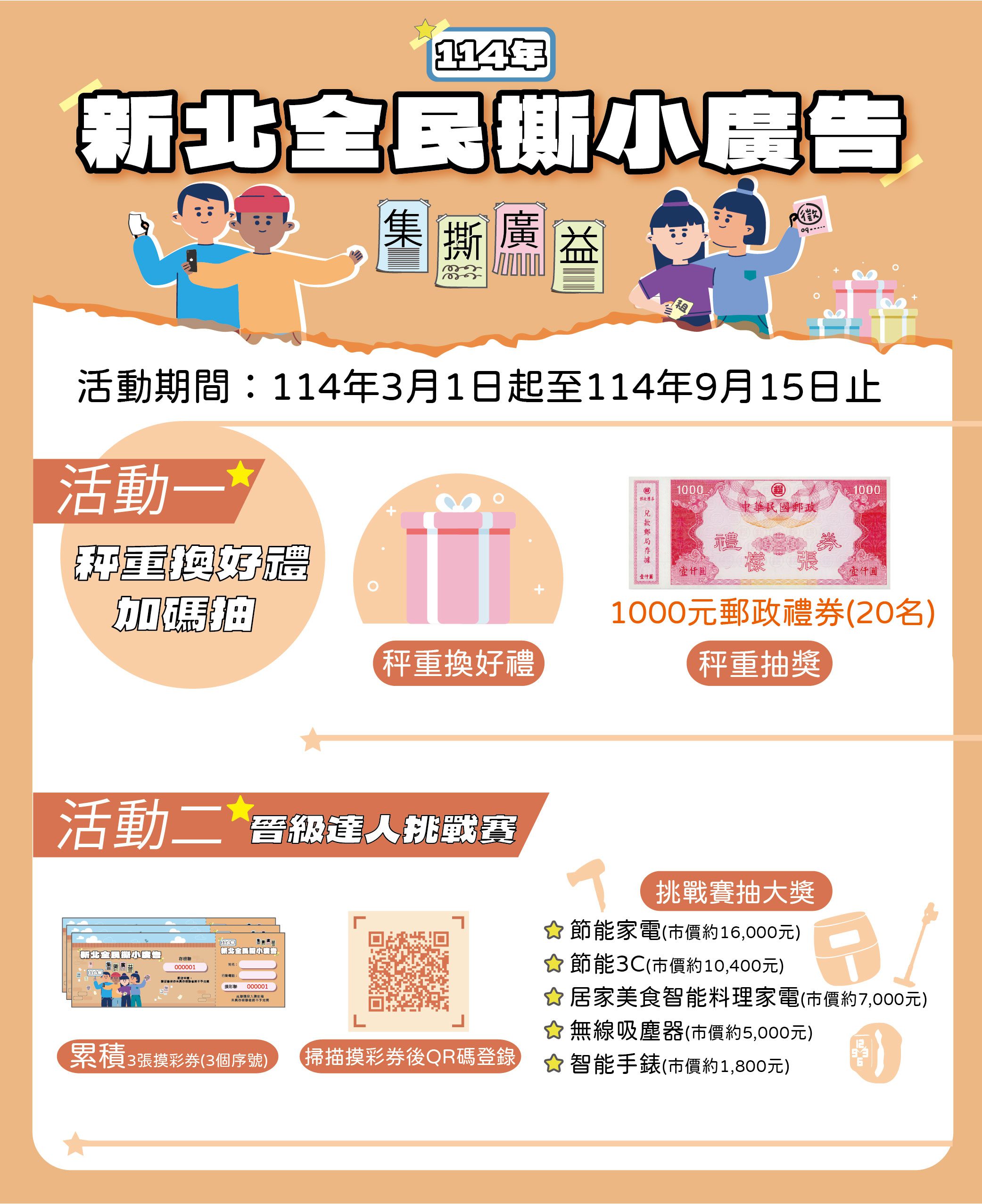 環保局說明,今年「集撕廣益」活動自3月1日至9月15日止,採雙重參與得好禮,活動一為「秤重換好禮加碼抽」,每撕除1公斤小廣告即可兌換環保生活好禮,如衛生紙、專用垃圾袋等,並可額外獲得1張摸彩券,於活動結束後將抽出1,000元郵政禮券共20名。另外活動二的「晉級達人挑戰賽」特別將門檻降低從原本的5公斤調降為3公斤,民眾只要撕除滿3公斤違規小廣告,送交新北市任一區清潔隊回收,就可參與活動二「晉級達人挑戰賽」,民眾累計獲得3張摸彩券後,掃描摸彩券上QRcode填寫相關資料並上傳3張摸彩券存根聯照片,有機會再抽大獎,包含節能家電、智能3C產品等16名獎項,總價值超過7萬元,獎品豐富。