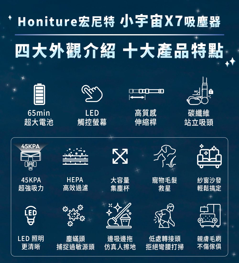 Honiture 小宇宙 X7 吸塵器具有多項先進功能,設計精緻,並且充分考慮到現代家庭的需求。這款吸塵器搭載了 20000mAh 大容量電池,能夠提供長達 65 分鐘的無線運行,讓用戶無需擔心電量問題,能夠輕鬆完成全面清潔。其高科技 LED 智慧觸控螢幕操作設計,使得使用者可以輕鬆掌握清潔模式,且介面簡單直觀,任何人都能快速上手。吸塵器的伸縮桿採用鋁合金霧面材質,不僅外觀精美,且可以靈活調整長度(45~70 公分),方便各種清潔需求。