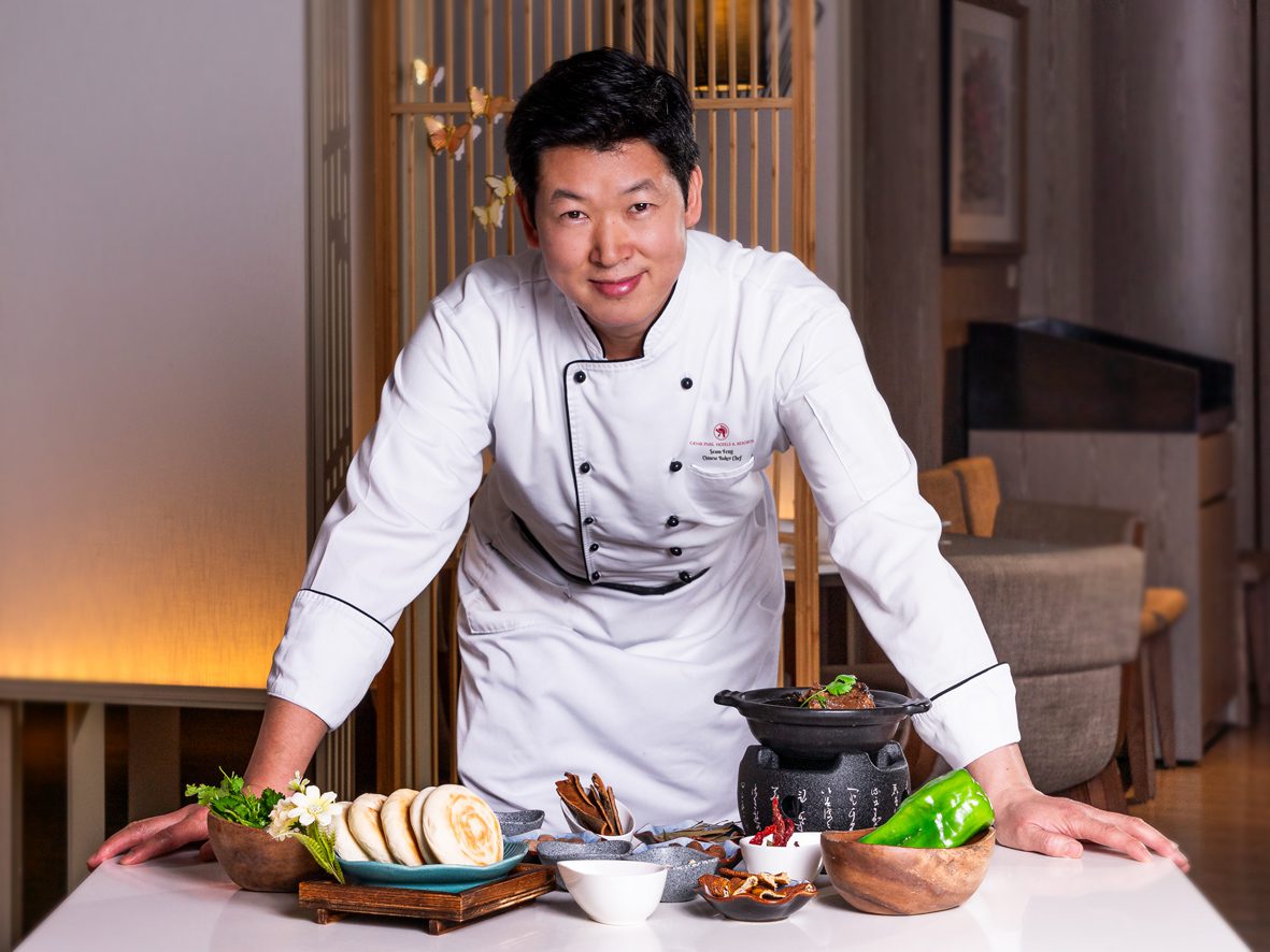 此次菜單改版,飯店特別邀請擁有逾20年粵菜經驗的王裕賢主廚,與深耕陝西麵食的馮永田主廚聯手打造。王主廚以粵菜為基底,工序繁複、火候精準:他將豬耳與豬舌滷製三天,切薄蘸紅油,化身開胃「悄悄話」;又將帶骨牛肋排汆燙入味後,200度悶烤再桃木燻1分鐘,推出「桃木燻烤牛肋排」;更融合川味與粵技的「怪味嗆鍋蛋」,以香酥蛋白配上芝麻魚露辣渣,麻辣醬香令人一試難忘。