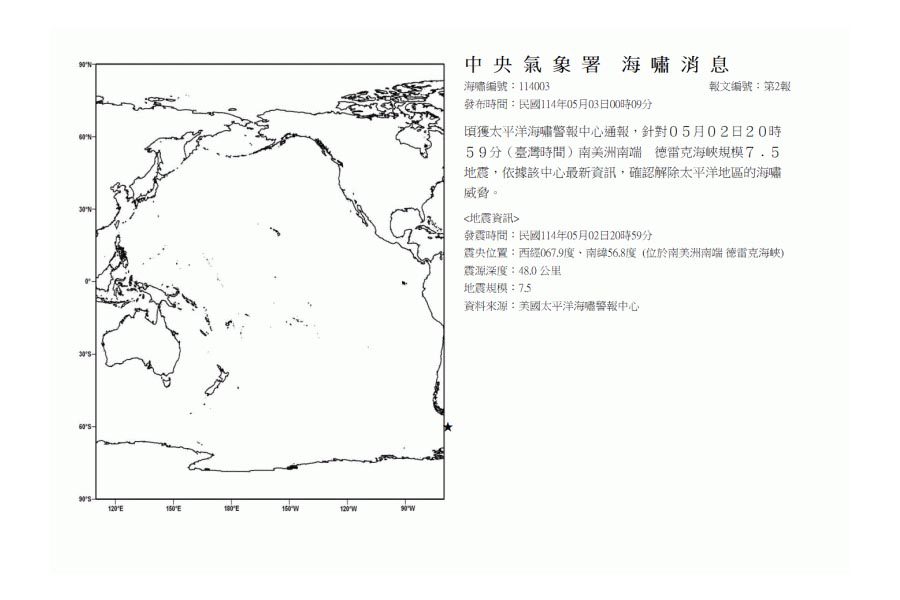 臺灣時間5月2日20時59分,南美洲南端德雷克海峽發生規模7.5地震,智利海嘯警報狂響,而阿根廷稍早也發生7.4極淺層地震,太平洋海嘯警報中心也隨即發出海嘯警報通報,直到5月3日凌晨零點9分依據最新資訊,確認解除了太平洋地區的海嘯威脅。