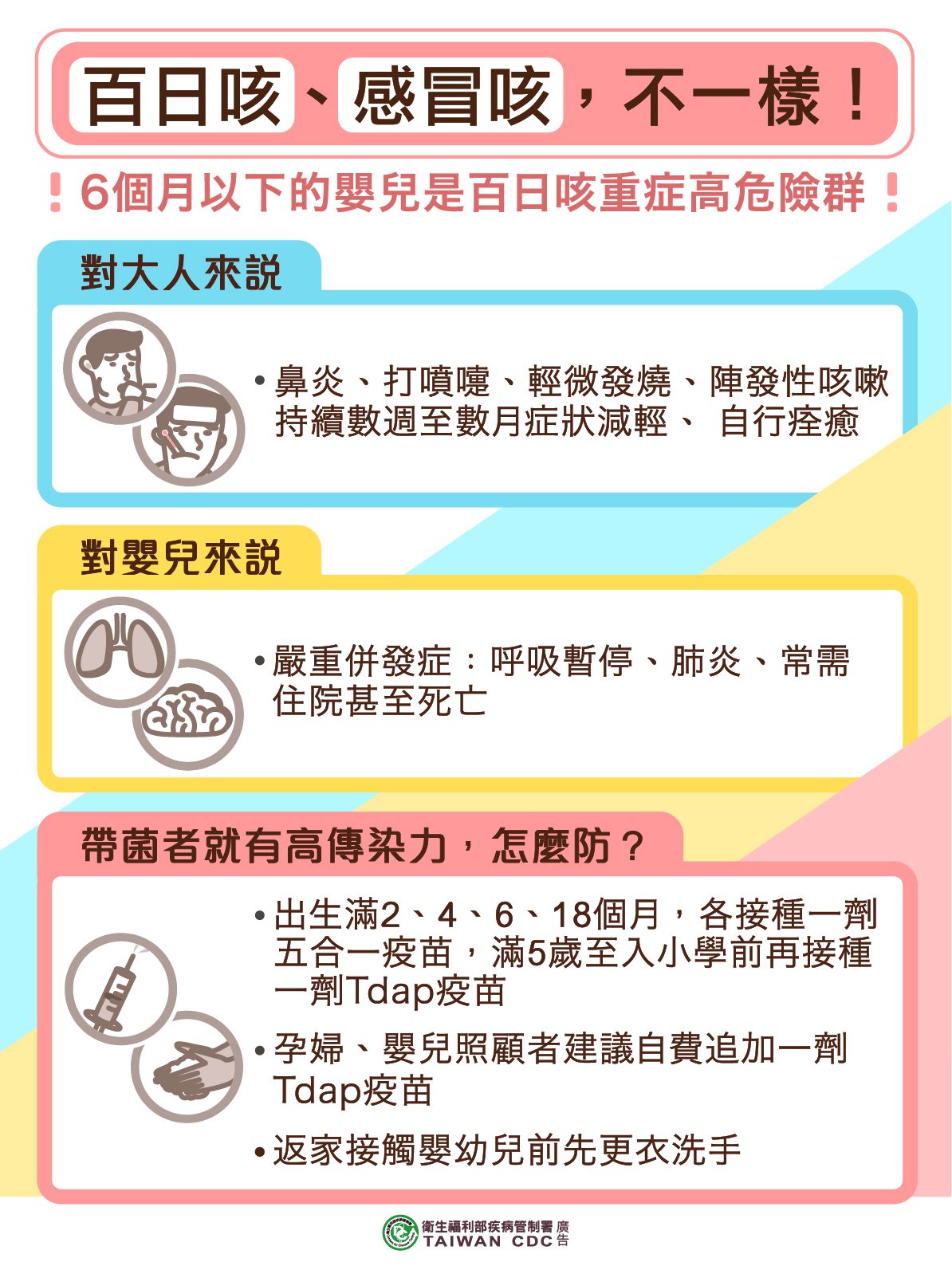 台東縣衛生局表示,接種疫苗為預防百日咳最有效的方法,目前我國提供嬰幼兒於出生滿2、4、6、18個月,以及滿5歲至入小學前各接種一劑百日咳相關疫苗,提醒家中有嬰幼兒的家長,務必依時程至預防接種合約院所完成疫苗接種,讓幼兒可以獲得足夠的保護力。另由於近年國內百日咳病例多為尚未完整接種疫苗之3個月以下嬰幼兒,建議女性每次懷孕期間自費接種1劑減量破傷風白喉非細胞性百日咳混合疫苗(Tdap疫苗),最佳疫苗接種時機為懷孕第28-36週,有助於母親抗體傳遞給胎兒,進而保護胎兒及剛出生嬰兒。
