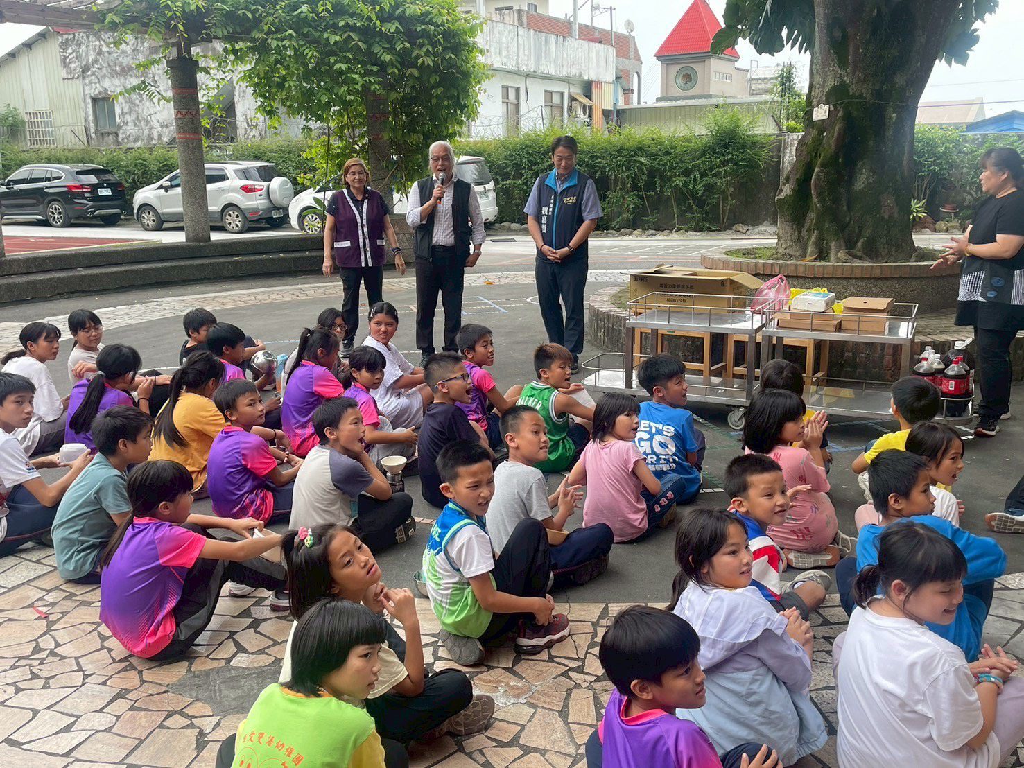 ▲景美國小學生在大樹下享用薯條等,不亦樂乎。(圖/魏嘉賢服務處提供,下同)