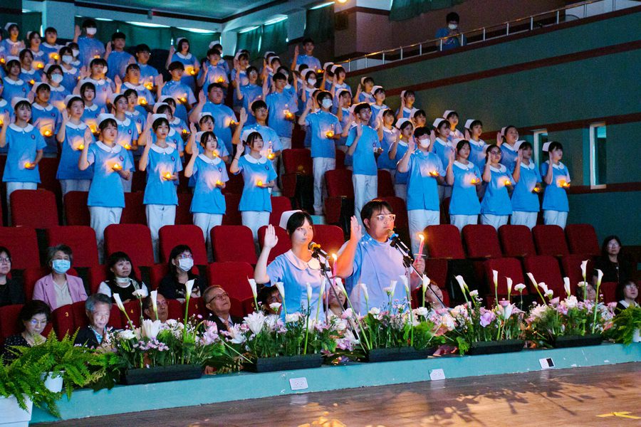 加冠生們接著打開手上燭光,並宣讀南丁格爾誓詞,象徵護理專業的傳承與承諾,亦代表他們即將正式進入護理專業領域,肩負起照護臨床病患與大眾健康的神聖使命。