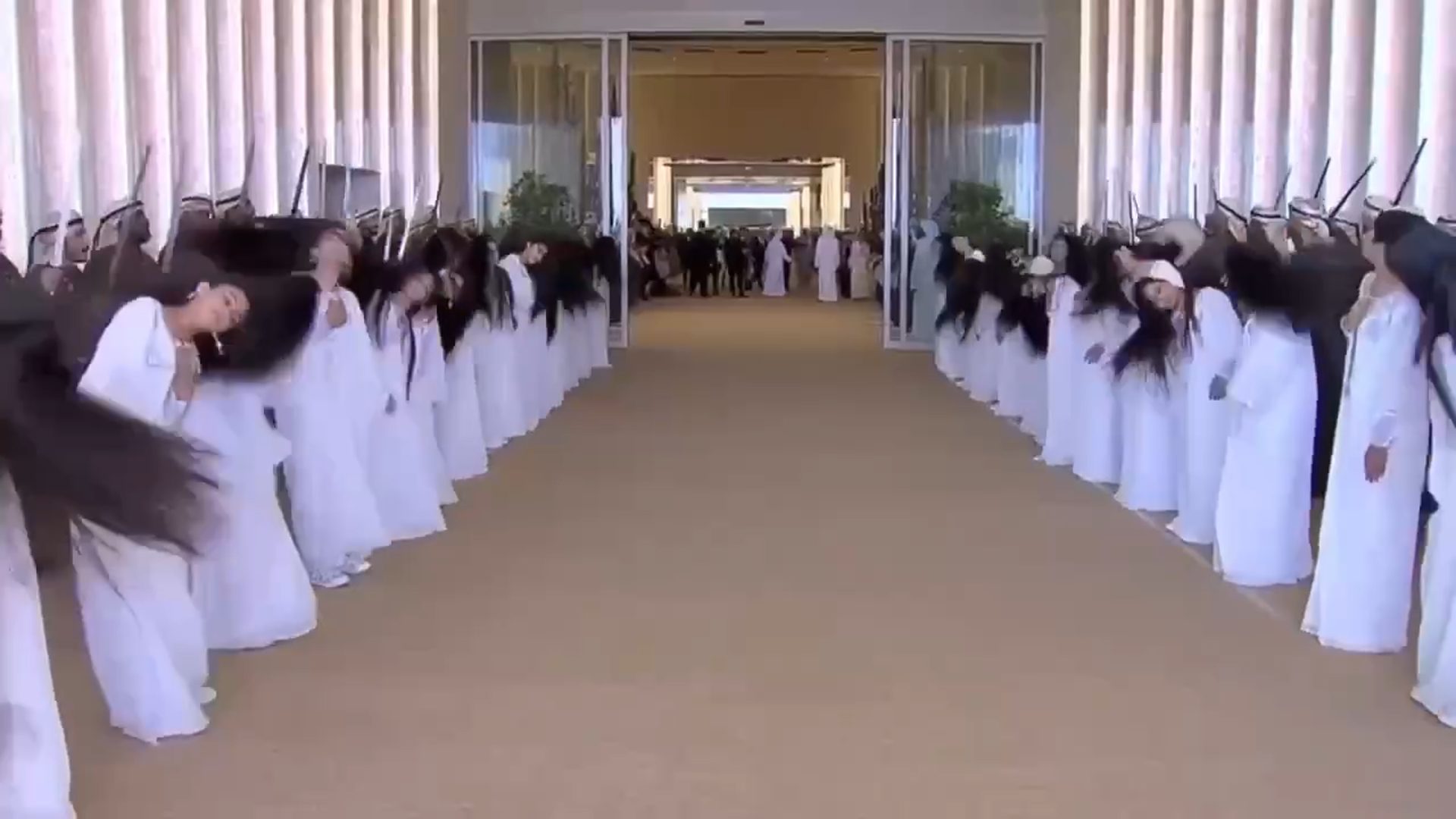 美國總統川普15日抵達阿拉伯聯合大公國訪問,受到當地安排數十名穿著白色長袍的女性,跳著傳統甩髮舞的歡迎,後方則有男子敲打鼓樂,吟唱詩句,營造出戰鬥場面的氛圍,讓川普相當的高興,而這樣的場合通常都會出現在婚禮或節慶等喜慶場合上,在阿聯與阿曼都相當的盛行。