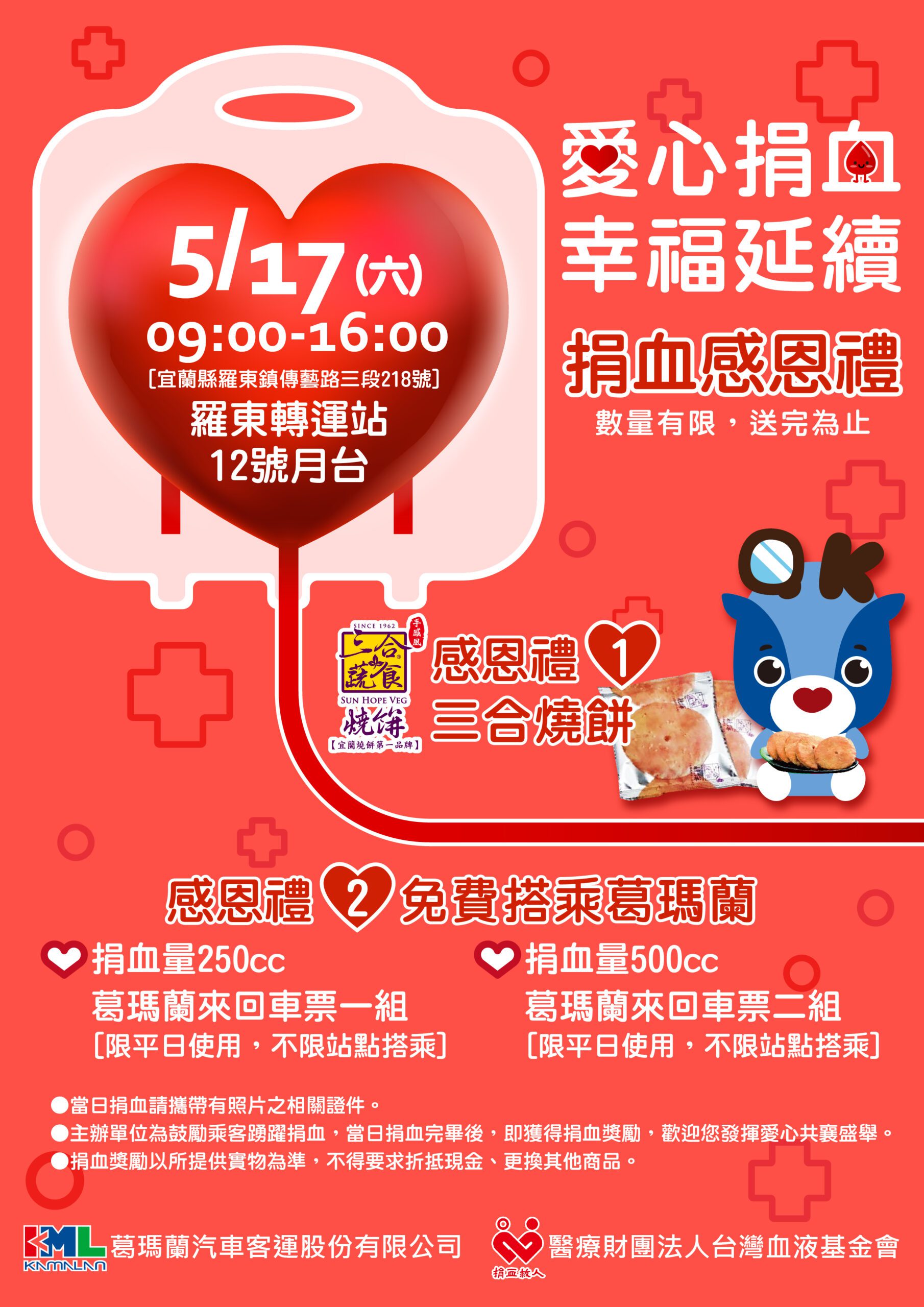 「捐血助人是一件利人又利己的善舉。」今年的捐血活動發出溫馨好禮,凡成功捐血250cc者,即可獲得宜蘭人的好滋味「三合燒餅」乙份與葛瑪蘭客運「羅東-板橋」最高票面額車票二張;捐血500cc者則可獲得雙倍贈禮,現場將有專業醫護人員駐點,提供完整的健康諮詢,讓參與民眾安心捐血。