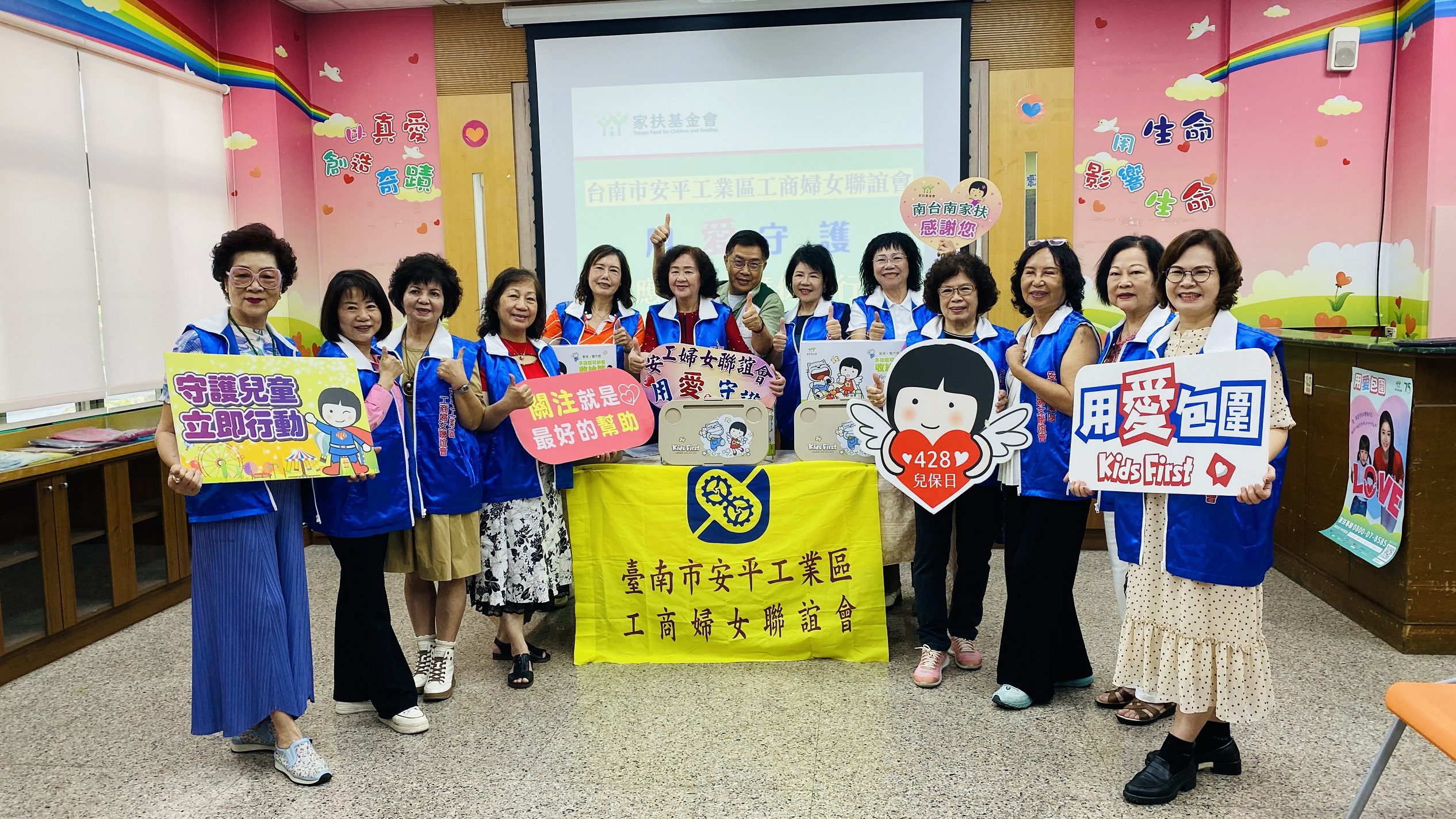 台南市安平工業區工商婦女聯誼會 (簡稱:安工婦女聯誼會),往年在開學之前總會在會內發起「疼咱的囝仔助學行動」,捐贈助學金幫助家扶的孩子『讀冊』;今年特別響應家扶兒少保護工作《用愛包圍計畫》,在會長邱碧月的呼應下,獲近40位會姐愛心響應,將兒童保護專款13萬元親自送至南台南家扶,以疼愛自己孩子的心來守護黑暗中受虐的孩子。